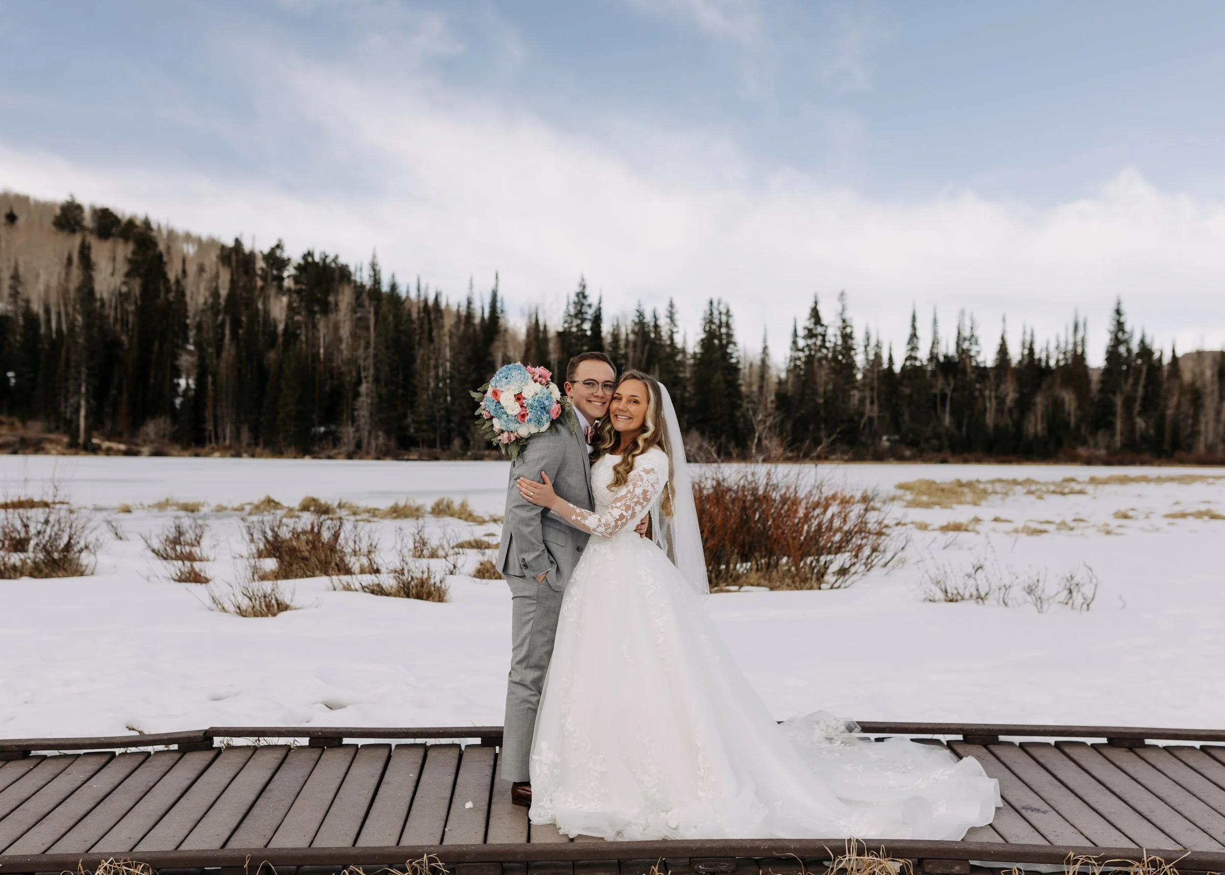 A bride and groom standing on a wooden dock outdoors in a snowy landscape, smiling and embracing, with a background of lake, trees, and cloudy sky.
